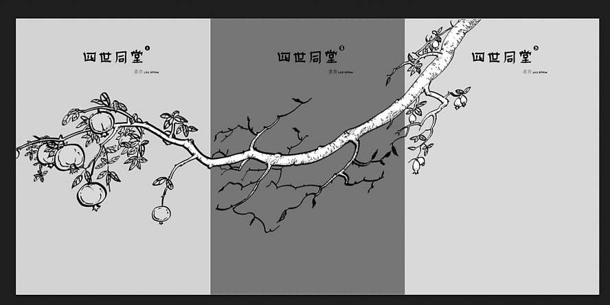 近日出版的“新风尚艺术插画系列”之《四世同堂》由当代艺术家吴伯文全新诠释、独具北平风韵的《四世同堂》,用今天的颜色画旧时的经典,全新插图再现浮世众生相。整体封面以一树石榴贯穿故事,3个分册都有自己独立的色彩:一枝石榴跨越3个季节,暗喻着大时代的动荡与变迁;《惶惑》是秋日石榴满缀的丰润的黄色调;《偷生》是冬日石榴枝叶凋零萧瑟的蓝灰色调;《饥荒》则是春日石榴枝上待放的新芽萌动希冀的粉色调。