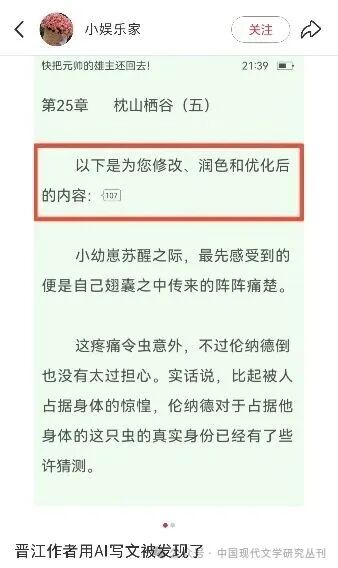 随着大量AI生成作品的涌入,网络文学场域的张力随之被注入新的意义内涵。一方面,或许让·鲍德里亚早已为我们敲响了警钟:“我们生活在一个信息越来越多,而意义却越来越少的世界里。”[12]利用人工智能大规模“水文”所带来的内容生态膨胀,使得各个网文平台的作品“量”虽能迅速堆积,“质”却未必能与之齐头并进,大量同质化文本的涌现可能反而遮蔽了真正具有表达力与思想性的优秀作品。晋江文学城、起点中文网等老牌网络文学网站,虽有心进行防控,但面对投稿数量的指数级激增,现有的审核与筛选手段已显捉襟见肘、防不胜防。晋江签约作品《快把元帅的雄主还回去》的第25章“枕山栖谷”,其开篇竟明目张胆地保留了AI提示词指令“以下是为您修改、润色和优化后的内容”,引发读者一片哗然,目前该章节已被平台锁定。[13]起点中文网上同样有例可循,其被收入精品频道的小说《从小镇做题家苟成大医》(后更名为《医疗系学霸》)在第686章的结尾处,也出现了一段未被删除的AI润色指令。[14]除去这类“原汁原味”的AI生成痕迹以外,不少作品字里行间留下半遮半掩的“AI痕迹”。以晋江上架于2025年3月的签约作品《予你心安》为例,文中主角徐以安将“马克杯”摔进医疗废物箱后,却产生了“满地青花瓷碎片”,随后她又捡起地上的“玻璃”,物品材质的矛盾明显暴露出叙事逻辑的断裂,这种常识性的错误恰恰是算法“抽卡”式写作缺乏具身认知的典型表现。“劣币驱逐良币”的残酷局面在番茄平台显现得尤为清晰。同样以番茄平台3月1日的首秀作品为例,“据网文大数据,该期首秀中在读涨幅超10万的作品仅29本,在读涨幅超30万的‘爆款’为0。与之相对的是2月1日1569本新书首秀中,31本作品在读涨幅超10万,亦有4本在读涨幅超30万”[15]。可见,AI介入之下网文的规模性涌入并未带来“爆款”的增长,反而使得真正有潜力的作品被大量平庸文本所淹没。更令人忧虑的是,AI写作的普及也使得“文本剽窃”出现了新的形态。早在2021年3月,就已有业内人士表示,“有的作者利用自动写作软件,将大量已有作品的文字内容复制拼凑到自己的小说中,再通过对他人作品进行语序调整、同义词替换等表达方式的转换,实现‘洗稿’”[16]。