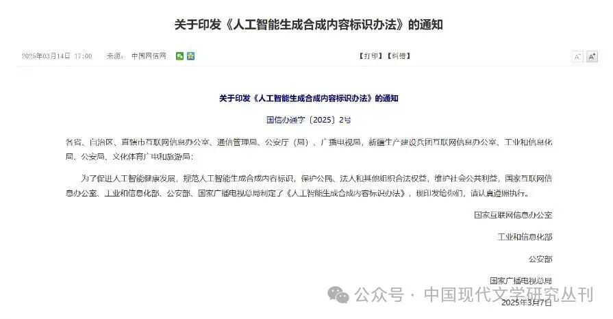 中国网信网发布《关于印发〈人工智能生成合成内容标识办法〉的通知》