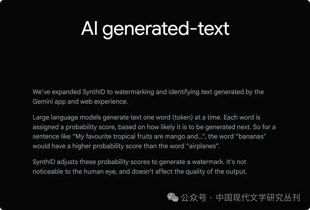 在创作规范日渐达成共识之后,如何有效识别并管控AI参与网文创作,就成为平台和作者共同面临的下一道难题。令人意外的是,相比于庆幸各个网文平台出台的管控举措使之在“人机对抗”中扳回一城,网文原创作者们更关切的其实是AI识别的可行性,以及由此带来的潜在风险。例如,在晋江宣布AI参与创作的界限之后,该公告的讨论区里不乏“真的不会误判造成冤假错案么?那些鉴定都不太靠谱,有点忧虑”[30]之类的质疑声。由此可见,AI创作浪潮中核心矛盾的指向,已经悄然转向对AI检测技术信度的怀疑。当前,用于文本类内容检测的AI识别技术,主要可分为两大类:一类是从结果出发,即通过AI检测工具识别文本中可能的“AI味”;另一类则是从源头入手,在AI文本生成的过程中嵌入某种“水印”标识,用以追踪与鉴别。当前AI生成文本虽已能够自如地模拟自然语言,但在涉及长文本的内容生成任务中,其语言构成依然表现出一定的倾向性,比如高频词语的固定化选择、句式结构过于工整、语义逻辑的突然跳跃等。这些细节通常不容易为人眼所察觉,但训练有素的大模型却可以在“统计”层面发现这些“非人类”的规律。以腾讯公司于2025年1月推出的“朱雀大模型检测”为例,其在官方网页中介绍,“文本检测中,LLM通常以低困惑度和突发性编写文本”,因此朱雀在经过使用“海量AI生成的数据和真实数据进行模型训练”后,可通过先进的文本检测算法等进行文本的识别与鉴定。[31]然而,这类检测存在局限性。朱雀在其页面介绍中就明确指出,在人类语言系统中广泛存在着通用表达方式与结构化写作规范,为AI的学习模仿提供了天然土壤,这一特性在网络文学等特定文体中表现得尤为显著。在处理这类文本时,“由于AI生成的文本和人类创作的文本在语言、情节结构上非常相似,这极大地增加了检测难度,极易引发误报”[32]。另一类“水印”式检测技术,即指在保持可读性与流畅性的前提下,在文本生成阶段就有意嵌入非扭曲水印,为其烙上“看不见的指纹”。Google DeepMind团队开发的SynthID-Text工具,就是这一领域的代表性探索成果之一,且已成功应用于Gemini和Gemini Advanced等系统。[33]值得一提的是,这类检测技术并不依赖于外部语料的比对,因而具有更强的可追溯性。不过,它也并非万全之策。只有当生成的文本未被人为二次干预时,植入的水印才能保持完整。但在实际的网文创作过程中,即使选择使用人工智能进行辅助,大部分写手也会对生成内容进行校正、修改等,水印的可识别性很容易被破坏。除此之外,考虑到各类人工智能大模型的权限问题,这类检测技术尚未能实现大规模的部署和应用。不论如何,这两类AI文本检测工具在其设计逻辑上,本身就包含着一种自反性的悖论,它们的有效性始终依赖于AI自身的不够好。一旦AI足够聪明,可以模仿甚至反向预测检测技术的运作逻辑,那么后者将很快失效。