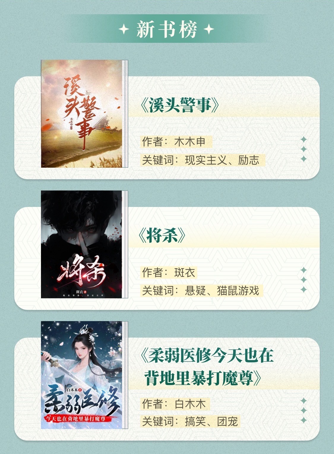在新书榜中,三部新作在类型文的基础上展开了新的突破。现实主义题材作品《溪头警事》扎根当下基层现实,通过数字化改革的生动实践让网络文学成为记录时代变革的载体,展现出网络文学参与主流价值构建的积极姿态。悬疑作品《将杀》在剧情爽感之外,深层次聚焦家暴、创伤与人性困局,使作品具备兼具类型吸引力与现实关怀的思想深度。女频玄幻作品《柔弱医修今天也在背地里暴打魔尊》则通过对人物的反套路设定与幽默的叙事风格,在遵循修仙类型规则的基础上完成创意重塑,为修仙类型写作提供了可借鉴的范式。