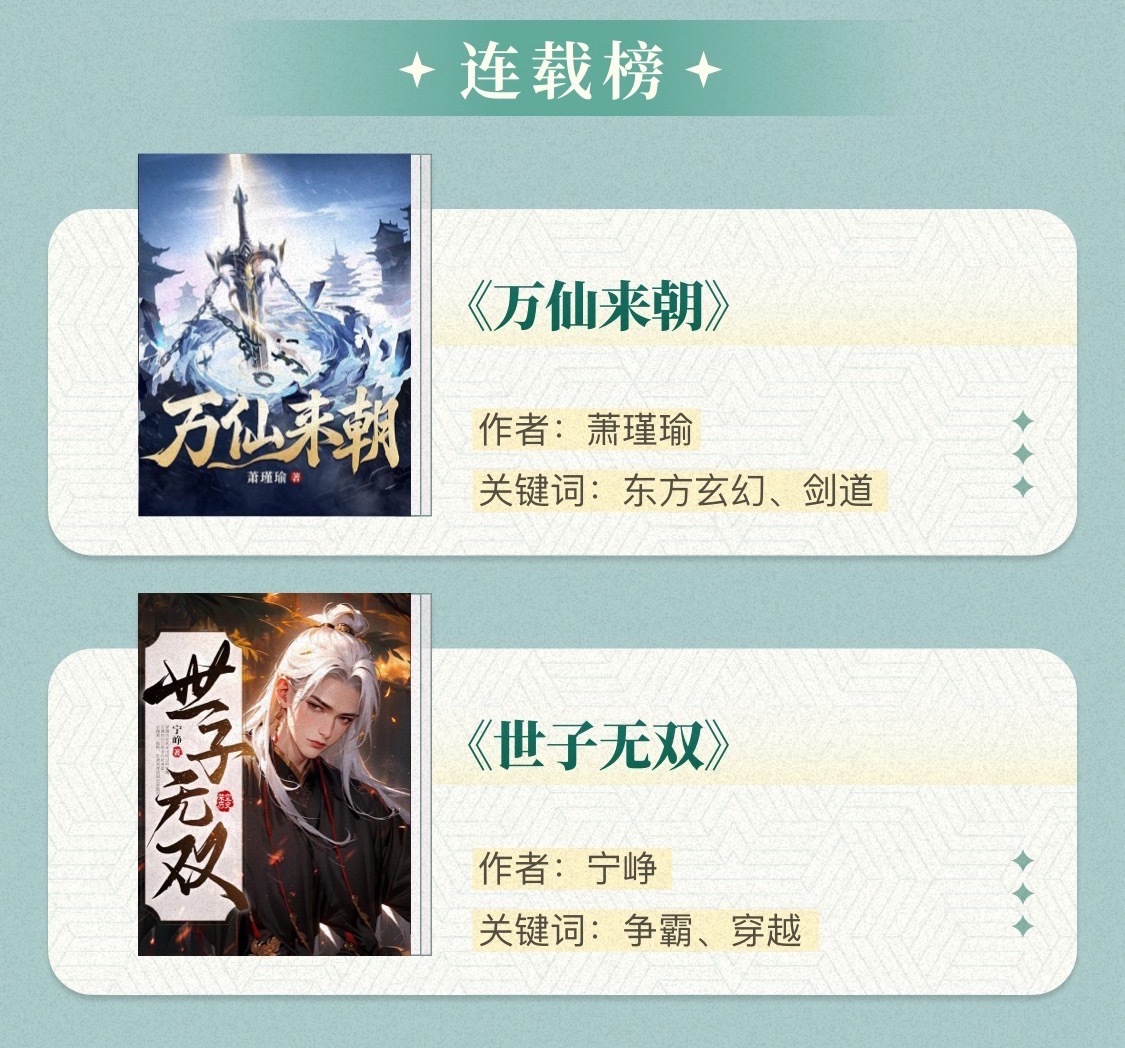 两部入选连载榜的作品中,都在多线的叙事结构下,将主角人物线与成长线刻画得更加饱满。东方玄幻作品《万仙来朝》以“诸天为囚笼,万仙皆狱卒”为核心设定,搭建出格局开阔的仙侠世界。大量配角各具性格与命运,却故事线彼此牵连,形成完整的因果网络,共筑“守望相助”的仙侠世界观。穿越题材作品《世子无双》将穿越设定与权谋结构紧密结合,以现代视角重构古代权力博弈的解题路径,人物内核塑造清晰坚韧。