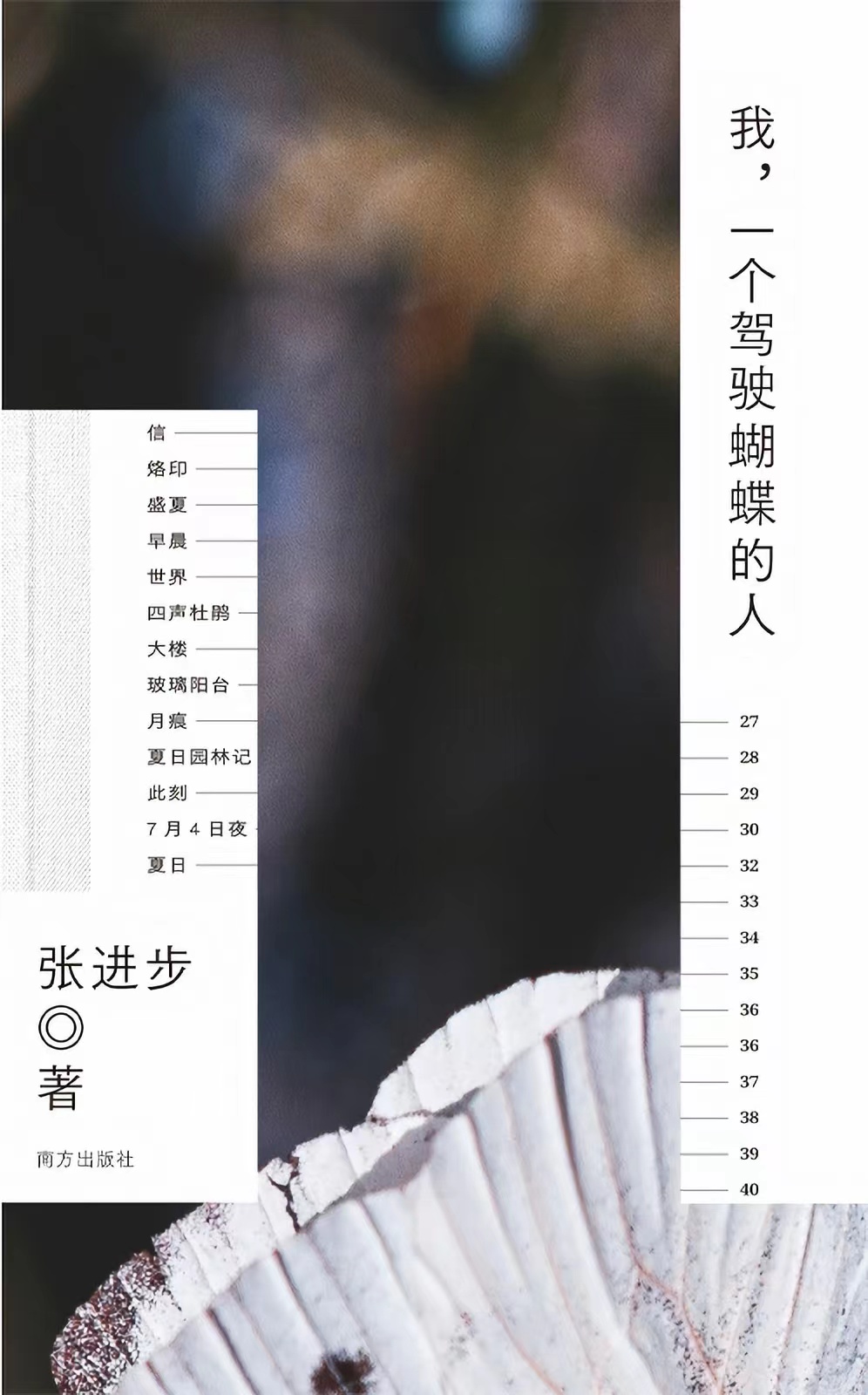 《我,一个驾驶蝴蝶的人》是诗人张进步的诗集,收录了诗人创作的127首短诗、1篇诗学随笔、1篇诗人专访。内容分为“菩萨是一阵细雨”“意象戏剧”“世界和它闪光的部分”“秋夜七弦”四辑。在这本诗集中,作者打破规则的藩篱,让万物纷纷涌入笔下,诗歌的内容更加丰富,诗歌的形式也更加自由。其中“秋夜七弦”是一部组诗,每首诗七行,每行都是长句,共20首,每首诗围绕一两个核心意象展开,符合诗人对“意象戏剧”的追求。