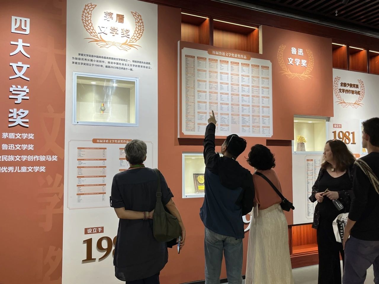 下午,大家来到中国当代作家签名版图书珍藏馆,这里展陈的500余位中国作家的1000余册文学图书、百余份手稿,充分展示了我国文学事业的辉煌成就。“在一个村庄有这样规模和品质的文学展览真是叹为观止”,土耳其汉学家吉来感叹说。在茅盾文学奖获奖作品展区,汉学家们争相指着陈列的获奖作品《平凡的世界》《长恨歌》《生命册》《本巴》等,激动不已地表示这是他们翻译过的作品,还时不时就各自熟悉的作家作品相互交流起来。