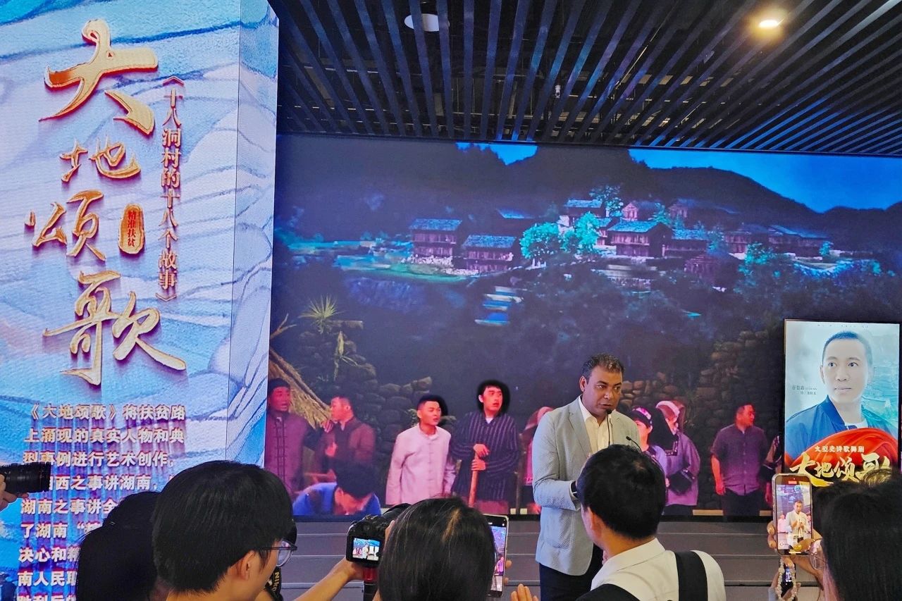 埃及汉学家白鑫惊喜地看到馆内展示的以湖南湘西十八洞村脱贫攻坚为原型的歌舞剧《大地颂歌》,他曾翻译过同一题材的《十八洞村的十八个故事》。“阿拉伯国家好像没有类似的报告文学。我翻译十八洞村的故事翻译了很久,要查很多资料。这本书告诉世界,中国是怎么做脱贫工作的,在埃及翻译出版后,反响很大,感染了很多读者。”白鑫表示,他也有兴趣将这个舞台剧翻译介绍到阿拉伯国家。