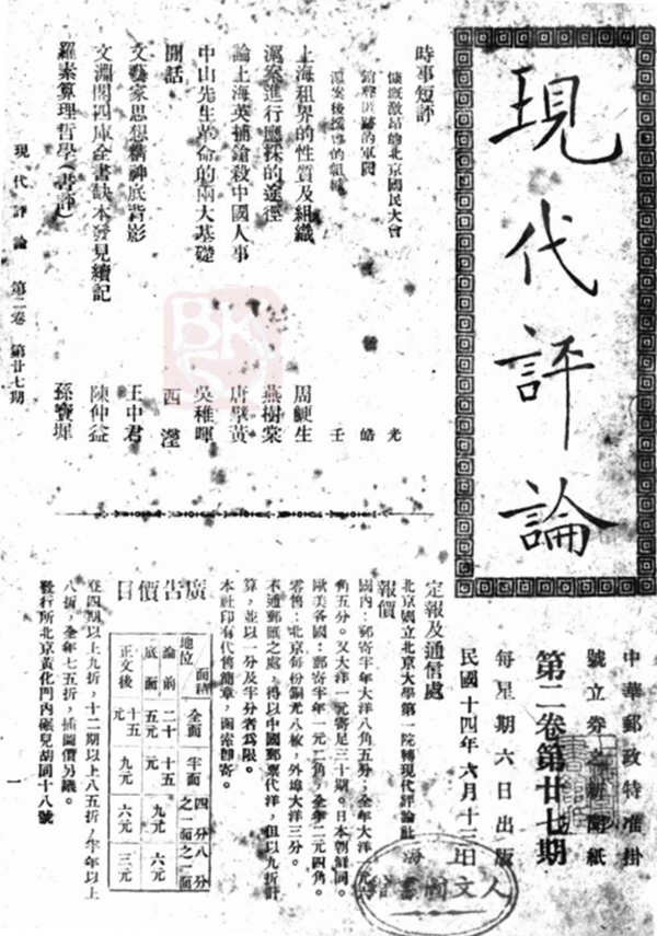 春台小峰之争,盖其中还有他们的纠葛,但观《北新周刊》所登广告,则确已多出关于政治之小本子广州近来,亦惟定价两三角之小本子能多销,盖学生已穷矣,而陈翰笙似大有关系,或者现代派已侵入北新,亦未可知,因凡现代派,皆不自开辟,而袭取他人已成之局者也。[22](1927年7月7日)