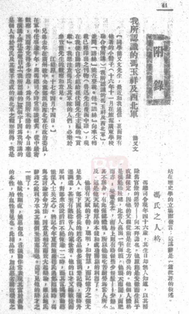 《我所认识的冯玉祥及西北军》原载《贡献》1928年第3卷第1期