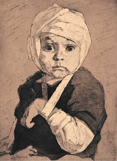 苏联版画家在艰苦的卫国战争中,同样延续着这种不屈的精神接力。在这片国土上出现了一大批号召人民奋勇抗战、揭露法西斯罪行的作品。托伊泽创作于1941年的石版画《祖国母亲在召唤!》中,身披红袍的母亲振臂高呼,召唤万千儿女共赴疆场,她手中的宣言书如战旗飞扬,身后刺刀林立直指苍穹。哈尔夏克的铜版画《被法西斯炸伤的孩子》则以纪实的线条刻画战争中的孩童——粗糙的绷带与清澈的双眸对比鲜明,无声控诉着战争的暴虐,为历史留下不容磨灭的证言。