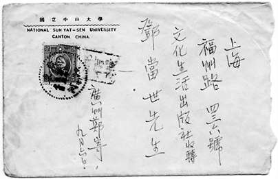 这封信使用的是国立中山大学的信封。根据史料,1934年,中山大学由原来的广州市区文明路迁往广州近郊的石牌。信封上的邮戳,有“广东 廿?年九月七日 沙(东)河”的字样,其中的“沙(东)河”为当时石牌中山大学所隶属的邮政分局的名称。