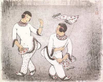 左侧女子着白底红花裤,梳双发髻,左手拈兰花指,手腕上的玉镯很显眼,右手持红花折扇。右侧女子右手执幡,左手拿着长流苏的红花折扇。红花、兰花指和镯子,让人看到柔美、矜持和幸福。可以想象,起舞时装饰与流苏伴随舞姿流转,幻化出多层流动花海。