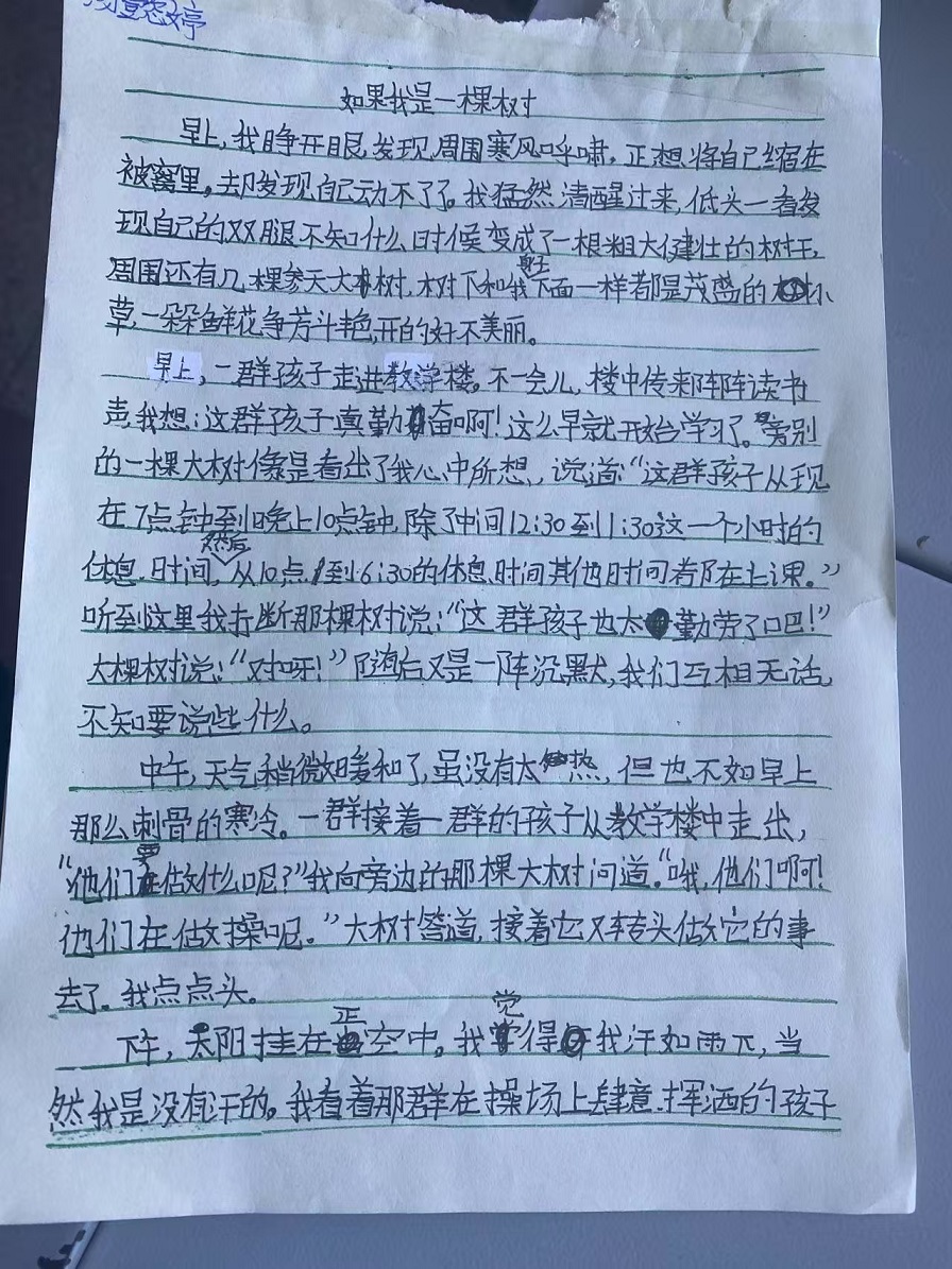 这是左昡的“创作实验”:她带着孩子们观察树、触摸树,有的孩子甚至尝试了啃树皮……在嘻嘻哈哈的打闹中,孩子们的感官世界被打开,与大自然相拥。回到教室,她在黑板上写下作文题:如果我是一棵树。孩子们瞬间安静下来,教室里安静到只听见纸笔摩擦沙沙的声音。