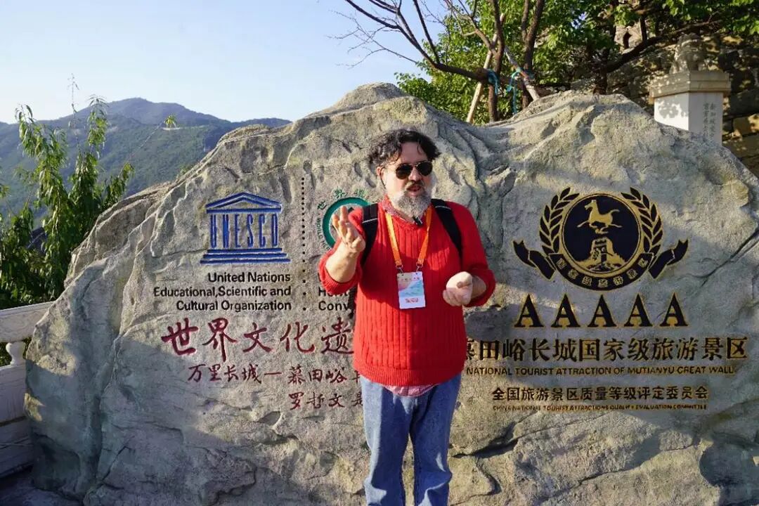 傍晚漫步慕田峪,夕照将整段长城点染成金色,远处层层叠叠的松涛和近处烽火台的剪影一同激活了史诗的声音。身临此地,阿根廷诗人马克西米利亚诺·莱尼亚尼心中激荡着难以自抑的澎湃情感。他说,长城是他穷尽一生梦寐以求的少数几个地方之一,自收到中国之行的邀请函起,他便不断追问这个抵达长城的梦想何时能成为现实。而今,梦想终于成真,马克西米利亚诺·莱尼亚尼感受到了这片土地上散发的能量、呼吸的历史,他认为,这完全诠释了“史诗”的真谛——“人类历史上所有史诗创作都以此为源泉。此刻我们既能追思中国诗人的瑰丽诗篇,也能遥想阿根廷诗人书写东方传奇的壮美文字。”在长城上,马克西米利亚诺·莱尼亚尼和中外诗人们从荷马史诗聊到博尔赫斯,尤其是后者,这位被拉美、中国乃至全世界作家反复引述的文学巨匠,正是他最早用中华文明的史诗意境与源远流长的神秘魅力,为阿根廷读者开启了认知的窗扉。“今日,我终于得以亲身体验这份传奇。”马克西米利亚诺·莱尼亚尼说道。