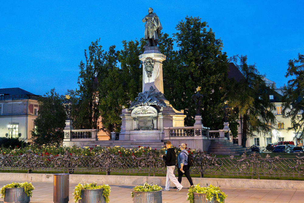 9月19日,在波兰华沙街头,路人经过波兰诗人亚当·密茨凯维奇纪念碑。 新华社记者 夏原一 摄