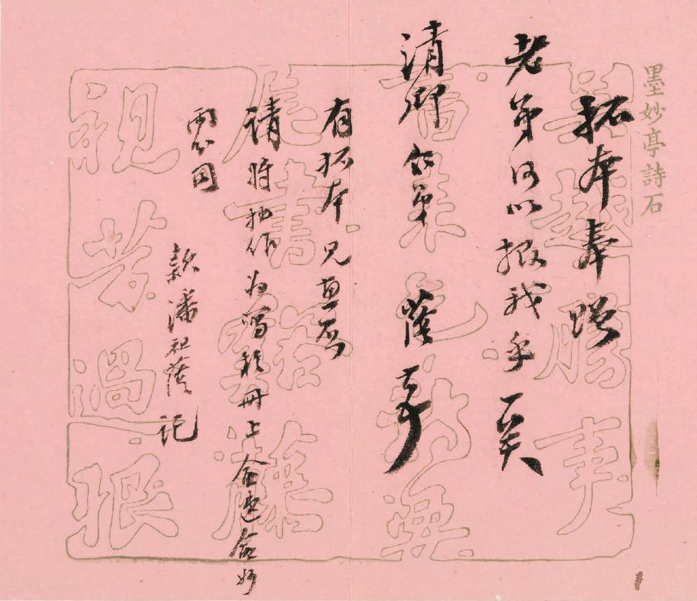 诗碑后来断了,成了残碑,有人取断碑一截凿成一块砚台,砚背犹存“吴越胜事”“书来乞诗要”“尾书谿藤”“视昔过眼”等17字。这17字被拓出来,双钩之后作为信笺的装饰背景。潘祖荫选用这一信笺给吴大澂写信,展示风雅,使此信附加了很高的文化成本。