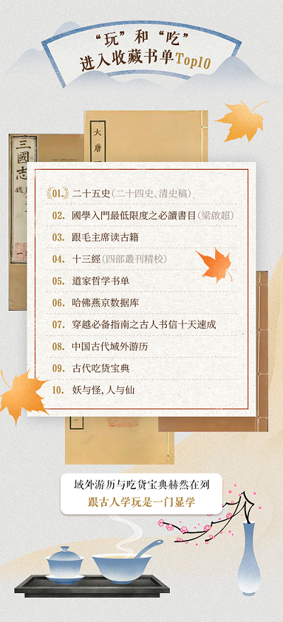 平台支持用户创建各类古籍书单,方便系统性阅读。其中,“二十五史(二十四史、清史稿)”书单登顶收藏榜首位。值得关注的是,“中国古代域外游历”“古代吃货宝典”等聚焦游历、美食主题的古籍书单也跻身榜单,从古籍中探寻古人“吃喝玩乐”之道成为一种热门趋势。