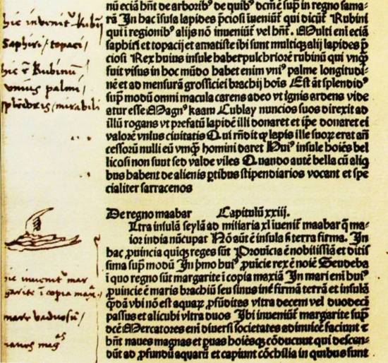哥伦布在拉丁文《马可·波罗游记》上所作的笔记。注意手指形状的标记,表明应特别注意。