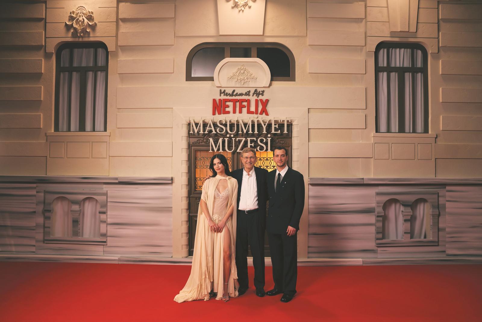 作家奥尔罕·帕慕克(中)和演员埃伊吕尔·坎德米尔(左)、塞拉赫丁·帕沙勒(右)共同出席了在伊斯坦布尔博斯普鲁斯希尔顿酒店举办的土语电视连续剧《纯真博物馆》首映礼。该酒店也是剧中最重要的场景之一。片方图片