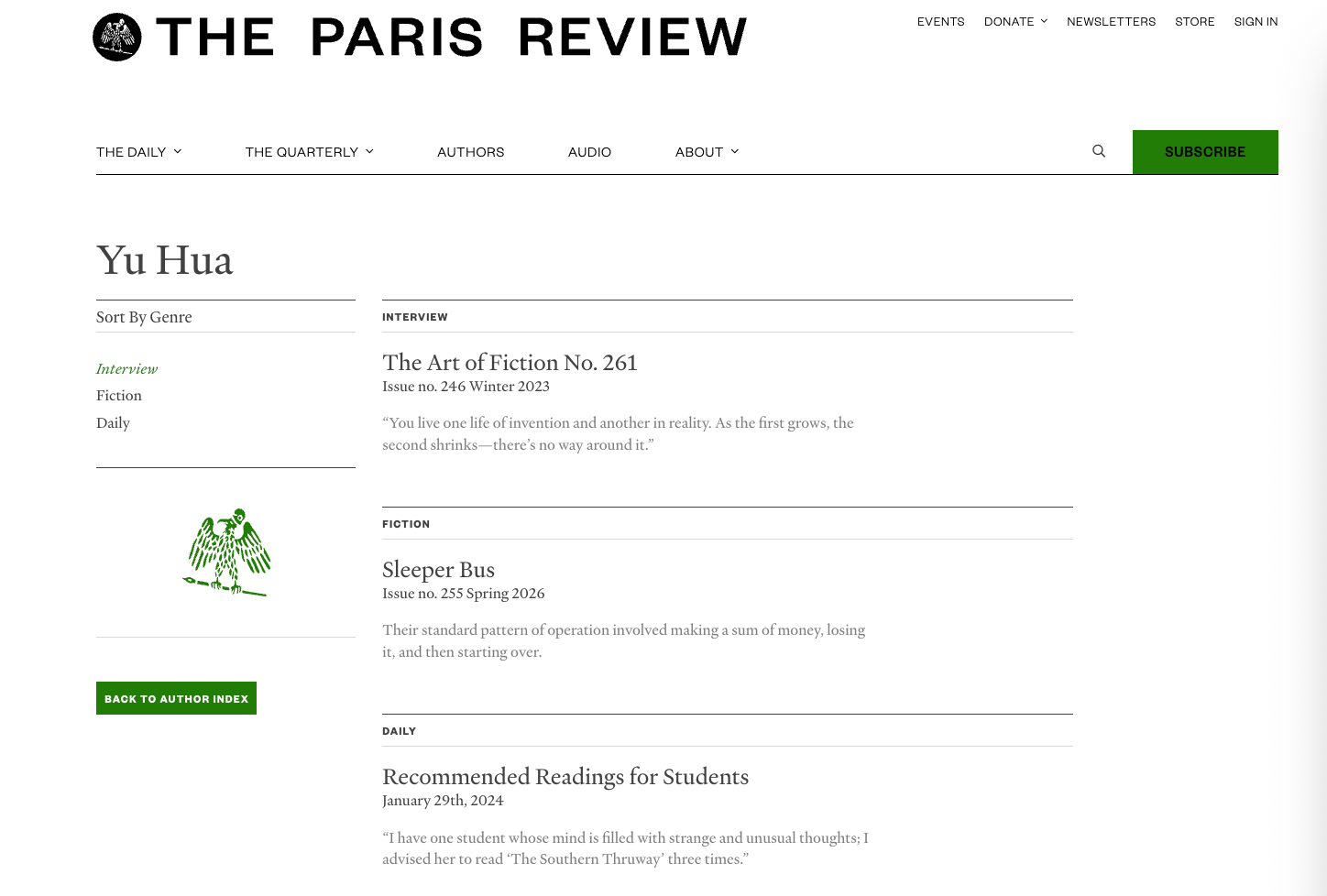 《巴黎评论》2026年春季刊首发了中国作家余华的最新短篇小说《卧铺大巴》(Sleeper Bus),开篇是两个人物的对话。
